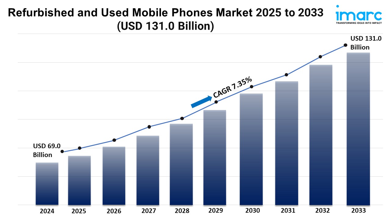 IMARC Group's report titled "Refurbished and Used Mobile Phones Market Report by Type (Refurbished Phones, Used Phones), Price Range (Low Price (Below $200), Mid-Price ($200 to $500), Premium (Above $500)), Distribution Channel (Offline, Online), and Region 2025-2033", The global refurbished and used mobile phones market size reached USD 69.0 Billion in 2024. Looking forward, IMARC Group expects the market to reach USD 131.0 Billion by 2033, exhibiting a growth rate (CAGR) of 7.35% during 2025-2033.